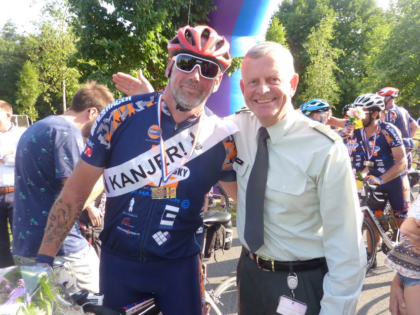 Generaal-majoor Gijs van Keulen, directeur Aansturen Operationele Gereedstelling van de Defensiestaf, voelde zich zo verbonden met dit project dat hij zelf enkele etappes meefietste. “Defensie ziet het belang van dergelijke initiatieven en daarom ondersteunen we graag. Met logistieke inzet, zoals transport, chauffeurs en militaire locaties in het buitenland. Het is fantastisch dat mensen dit zelf organiseren. Het geeft ze zingeving, ze stoppen er energie in, het biedt weer perspectief. Resultaat is een club positieve mensen met de wil om samen prestaties neer te zetten. Klasse, petje af! Ze hebben het met z'n allen gedaan, als team. Daarvoor past waardering en erkenning, en dat zeg ik hier mede namens de Commandant der Strijdkrachten.”