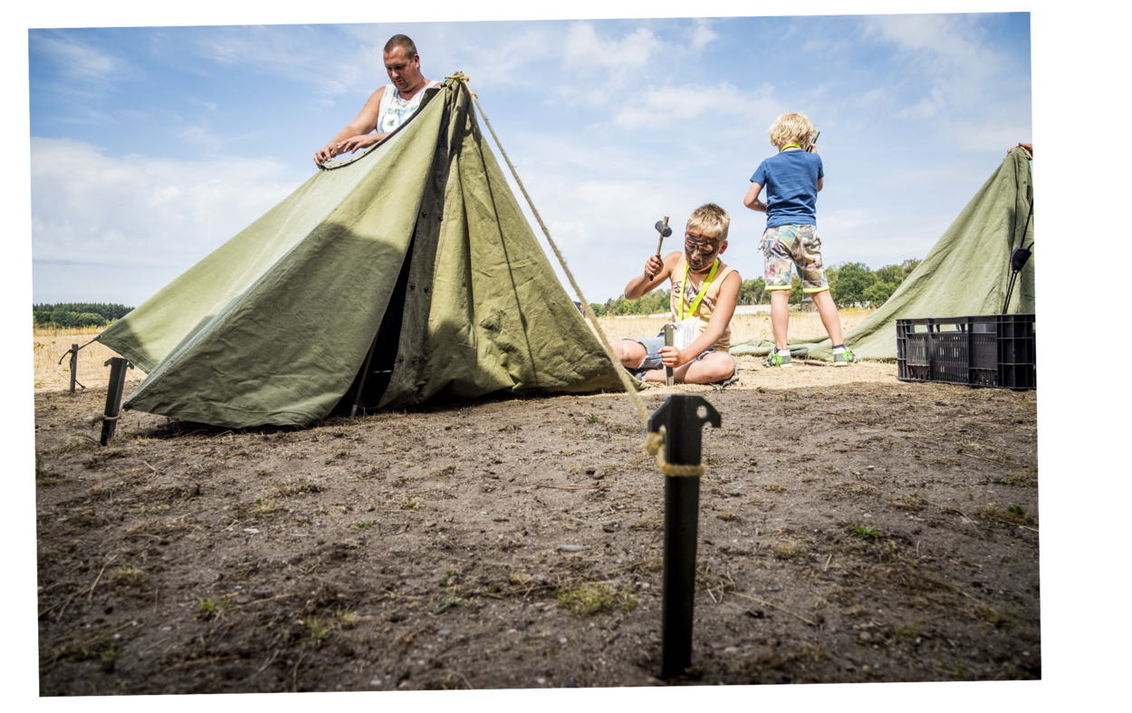 Damian (9) en z'n vader hebben het bivaktentje snel in elkaar. Het gezin komt uit Groningen en verblijft op een camping in de buurt van het museum. “We hebben vorige week nog ons eigen tentje opgezet.”