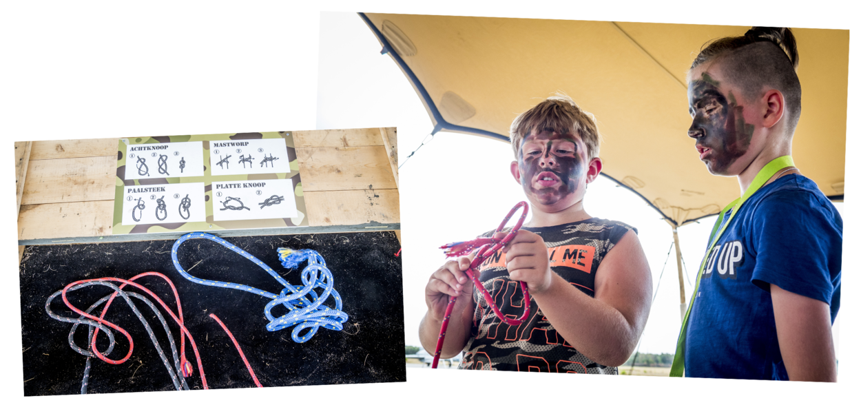 Onder hen veel toeristen, die in de omgeving Utrechtse Heuvelrug op vakantieparken verblijven. Zoals gezin Withaar uit het Groningse Scheemda. Zoon Damian (9) hoeft maar 1 knoop te leggen, maar tovert er zo 3 tevoorschijn. “Z’n opa zal wel trots op hem zijn. Die is ook militair”, vertelt vader Robert.