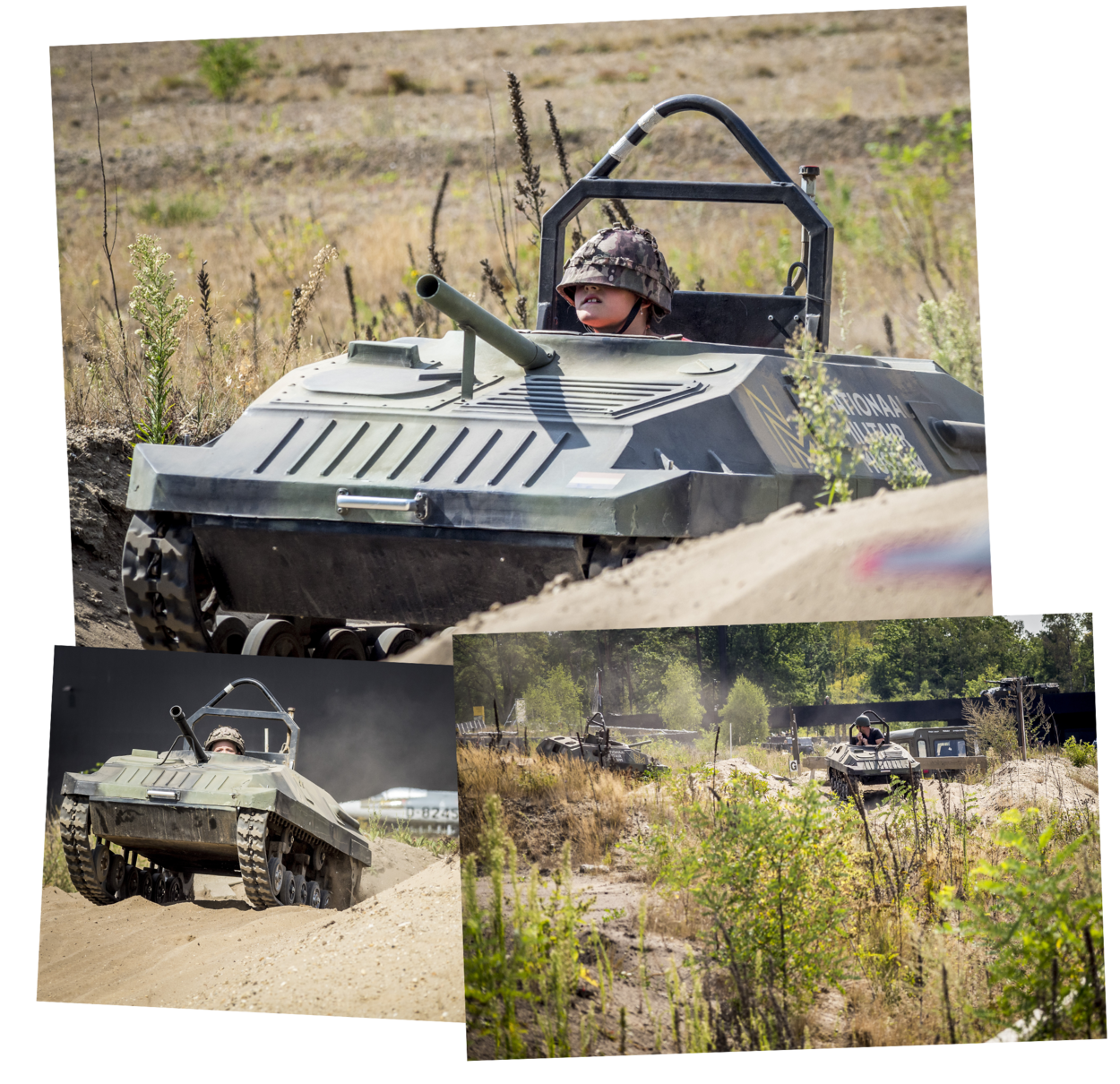 Het jongetje heeft ook al minitank gereden. Een activiteit die stiekem bij veel (jong)volwassenen populair is. Vader Leon vindt het helemaal niet erg om met zijn 8-jarige zoon mee te gaan. De kleine man van 1.35 meter groot kan net boven het ‘stuur’ uitkijken. Met een bezweet voorhoofd en tong uit z’n mond scheurt hij over het circuit, met zijn vader in z’n kielzog. “Het was echt leuk”, hijgt hij. “En helemaal niet spannend, want ik ben best stoer.”