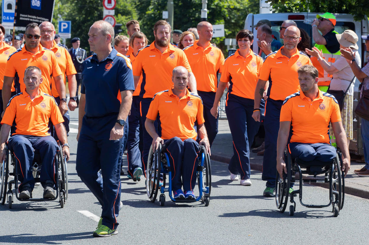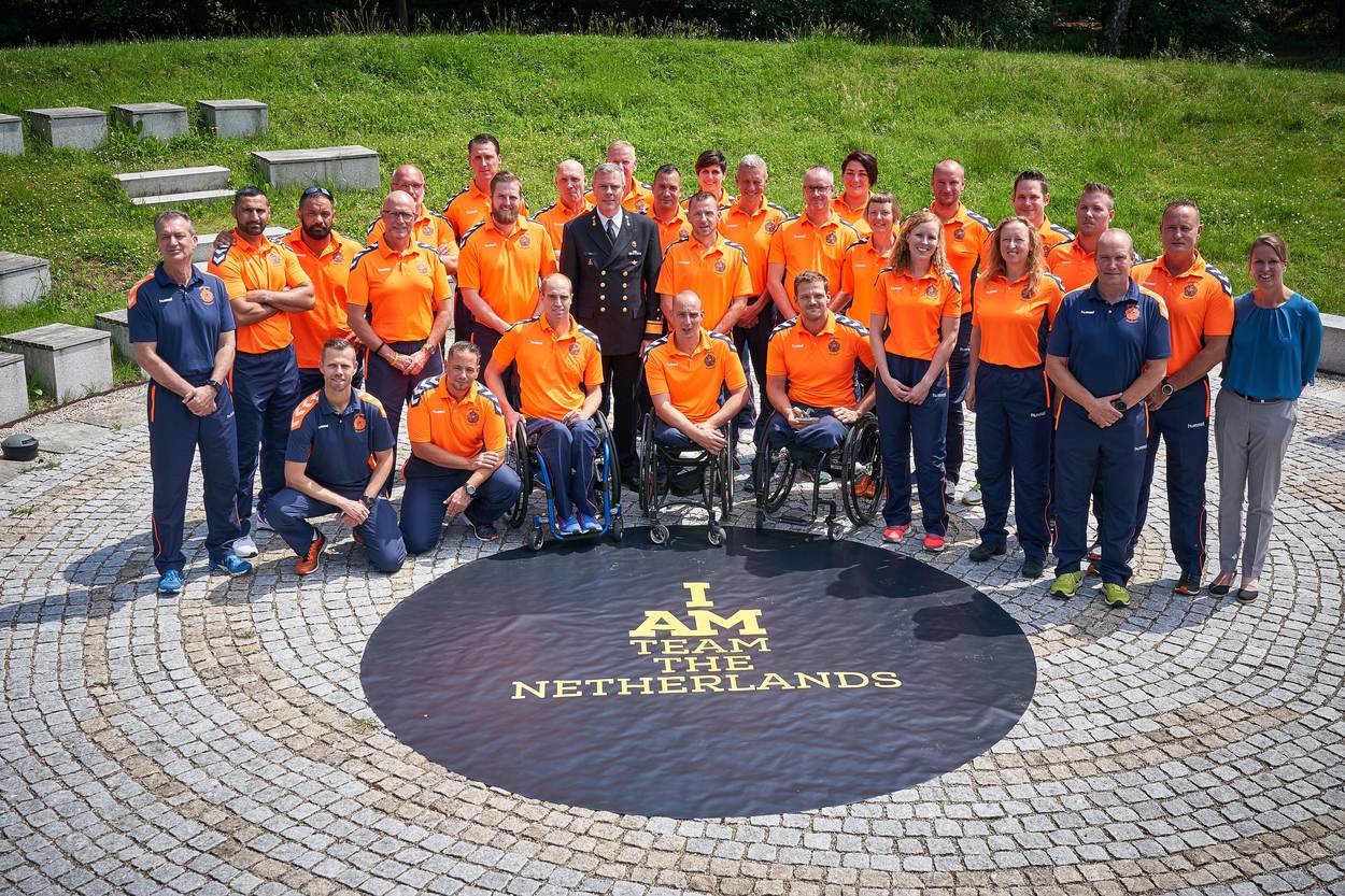 Aline Zoet (3e in de rechter rij) met de Invictusploeg tijdens Veteranendag 2018. Middenvoor en rechtsvoor ploeggenoten Jelle van der Steen en Marc van de Kuilen.