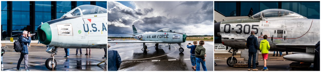 F-86 Sabres in 2 soorten. Links en midden de F-86F waarmee de Amerikaanse luchtmacht in 1954 op Soesterberg landde. De eenheid krijgt een jaar later de aanduiding 32nd Fighter Day Squadron en blijft tot 1994 op Soesterberg gestationeerd. Rechts een Nederlandse F-86K, bijgenaamd de Kaasjager, die ook Soesterberg als thuisbasis had.