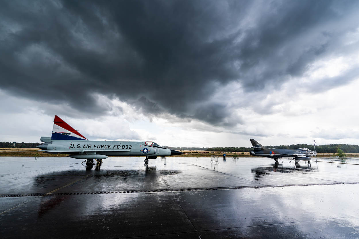 In de jaren 60 stonden deze Amerikaanse F-102 en Nederlandse Hawker Hunter ook gebroederlijk naast elkaar op Soesterberg. Maar destijds stonden ze paraat om bij dreiging vanuit het Oostblok, direct te kunnen opstijgen om het West-Europese luchtruim te verdedigen.