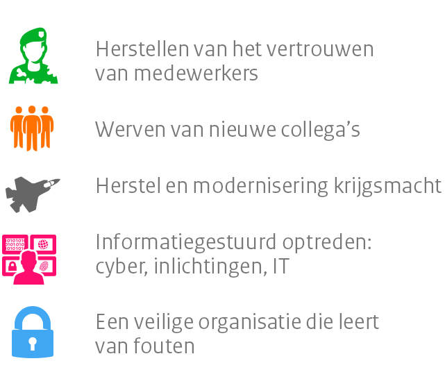 De komende jaren loopt die € 1,2 miljard extra op tot € 1,5 miljard per jaar. Met dat geld heeft de krijgsmacht 5 prioriteiten: