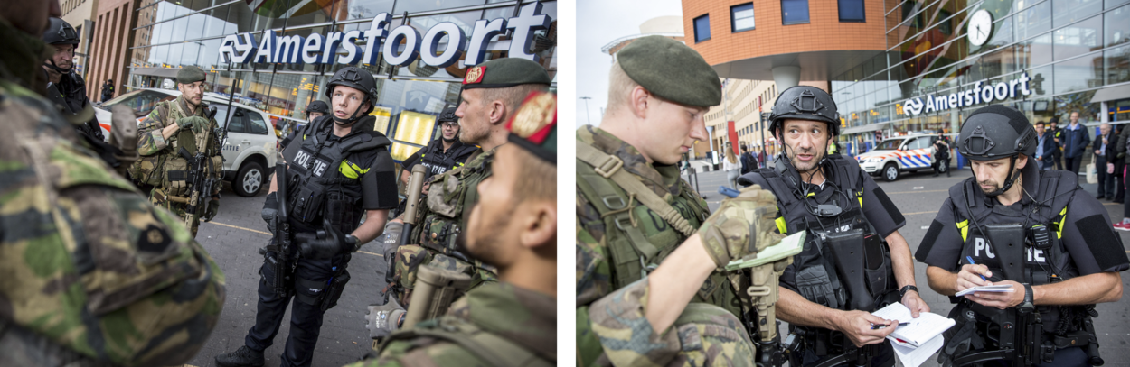 In het begin van de middag rijden zo’n 80 militairen van 44 Pantserinfanteriebataljon uit Havelte Amersfoort binnen. Tegen 18.00 uur neemt een deel van hen de politieposten voor Amersfoort Centraal station over. Een ander deel bewaakt 2 gebouwen verderop waarop een ‘verhoogde dreiging’ zit. De politie houdt de leiding. En ook zij laten een nieuwe, kleinere eenheid uit Limburg aanrukken.