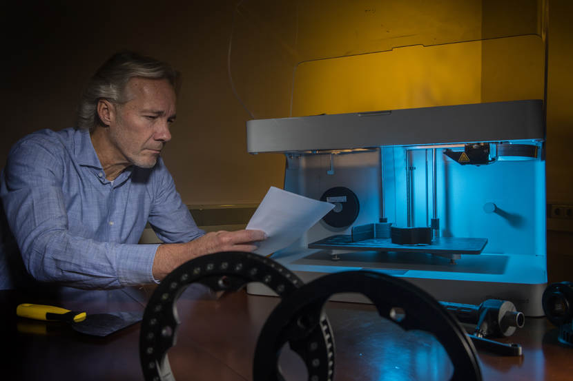 Innovatiemanager Bart Zwiep bij een 3D-printer.