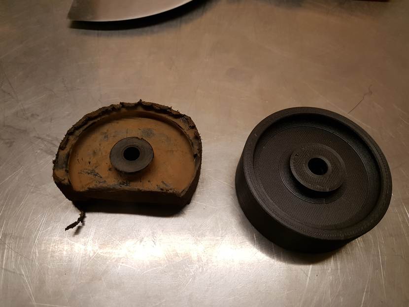 Links op de foto het versleten wieltje van een ligkarretje en rechts het nieuwe wieltje dat de 3D-printer heeft gemaakt op Kamp Castor in Mali.