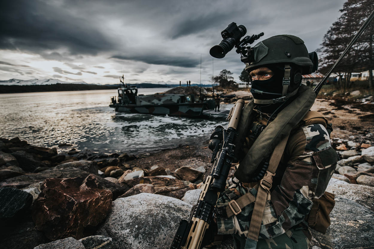 Zo is het pikkedonker wanneer duikers van de marine met hun onderwaterdrone een Noors baaitje onderzoeken. De ‘kikkers’ bekijken of er geen gevaarlijke objecten op de bodem liggen en hoe steil de helling van het strand is. “De omgeving is al afgezocht naar een vijand”, vertelt kapitein der mariniers Michiel. Hij is commandant van een Landing Craft Task Unit (LCTU) en de baas van een aantal landingsvaartuigen en gespecialiseerde eenheden. “Als de kuststrook geschikt is kan onze amfibische strandeenheid aan de slag.”