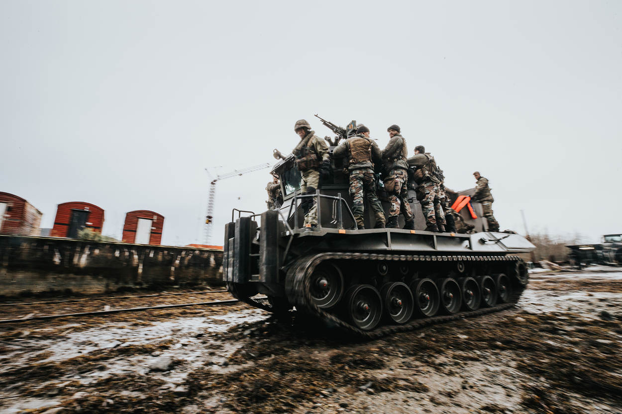 Gepantserde Vikings, de rupsvoertuigen van de mariniers, denderen door het Noorse landschap. Met deze voertuigen kunnen de zeesoldaten snel en in onherbergzaam terrein manoeuvreren.