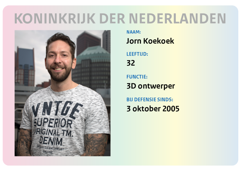 De stoere Jorn is als ontwerper wel een beetje een vreemde eend in de bijt. Met z’n brede schouders en getatoeëerde armen is hij het prototype militair, maar niet bepaald een computernerd. Zoals hij zelf omschrijft: “Mensen denken al snel dat je een oppernerd bent als je verstand hebt van IT en computers, maar dat is niet altijd het geval. Ik houd ook veel van (extreme) sporten. Gelukkig gaan veel projecten waar ik voor Defensie aan werk, over stoere onderwerpen.”