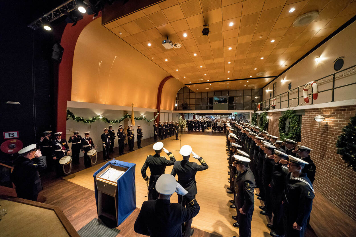 In de Dukdalf in Den Helder staan schepelingen van de School voor Maritieme Vorming, Bedrijfsvoering en Onderwijskunde aangetreden voor hun beëdiging. Een bijzonder moment in de loopbaan van iedere militair en defensieambtenaar. Foto: John van Helvert.