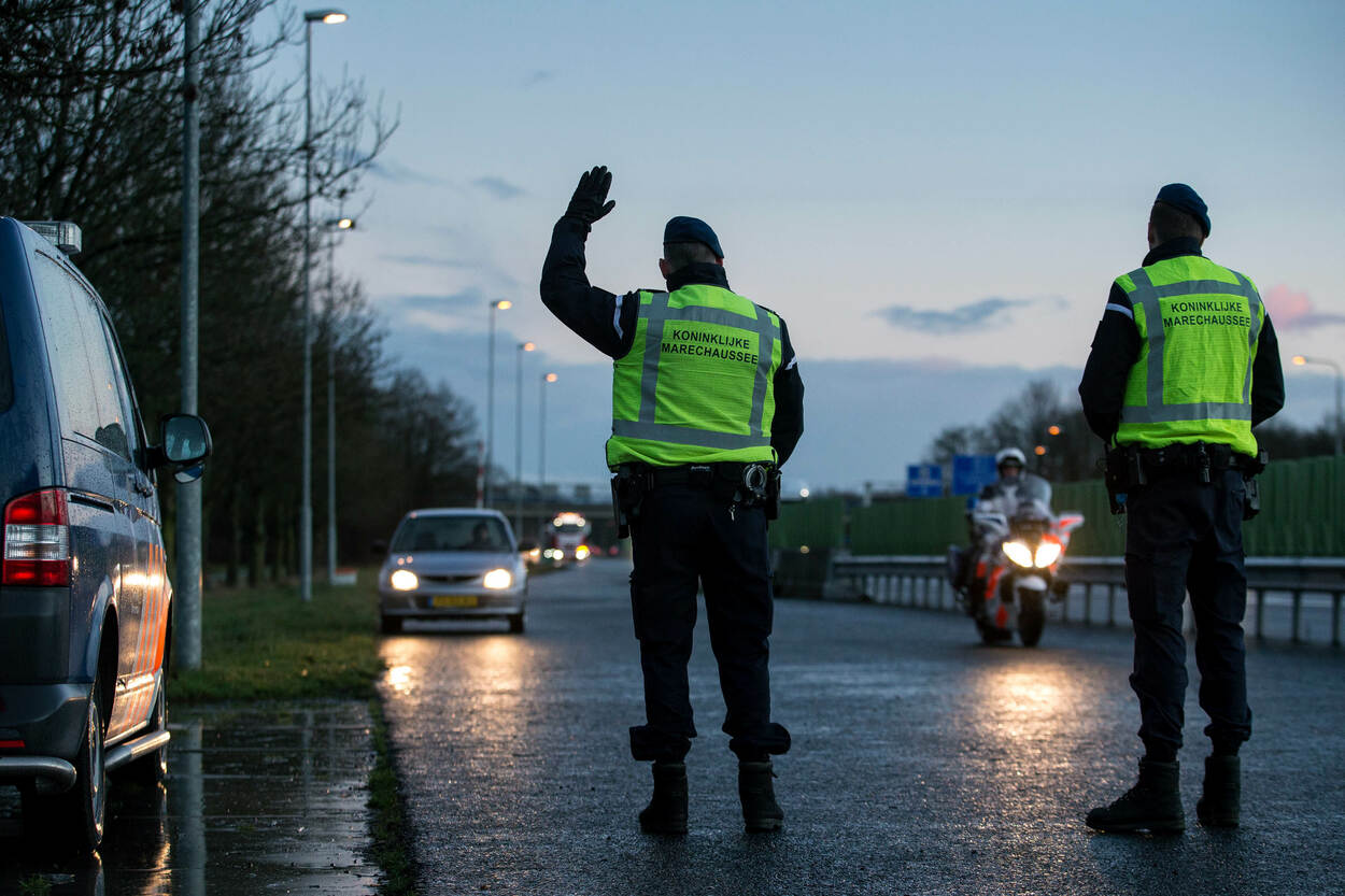 Sfeerfoto van een zogenoemde MTV-controle van de Koninklijke Marechaussee aan de grens bij Zevenaar. MTV staat voor Mobiel Toezicht Veiligheid. Foto: sergeant-majoor Gerben van Es.