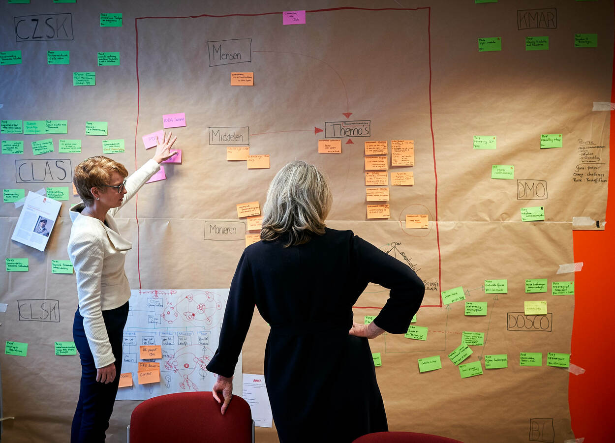 Met een ‘geeltjesdoolhof’ wordt FME-voorzitter Ineke Dezentjé Hamming duidelijk hoe de defensiestructuur globaal in elkaar zit. Eerder deze maand wisselden de voorzitter en plaatsvervangend Commandant der Strijdkrachten, luitenant-generaal Martin Wijnen voor 1 dag van functie. Foto: Phil Nijhuis.