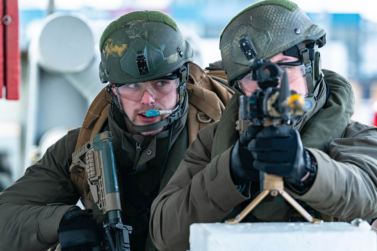 Dinsdag vond in Den Helder een oefening plaats, die onderdeel was van de opleiding Maritime Intervention Operations. In deze opleiding leren mariniers onder meer hoe ze veilig aan boord van schepen komen. Foto: Louis Meulstee.
