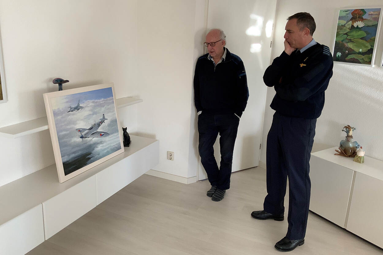 Kolonel Koos de Rooij kijkt naar een schilderij dat de vader van een collega voor hem heeft gemaakt. Op het doek staan een Spitfire (Britse jachtvliegtuig) en F-16, die kolonel De Rooij zelf gevolgen heeft. Foto: meneer Van Dorp.