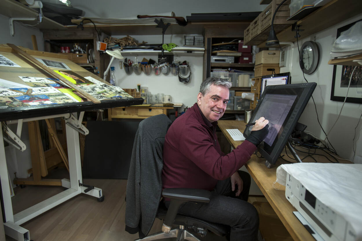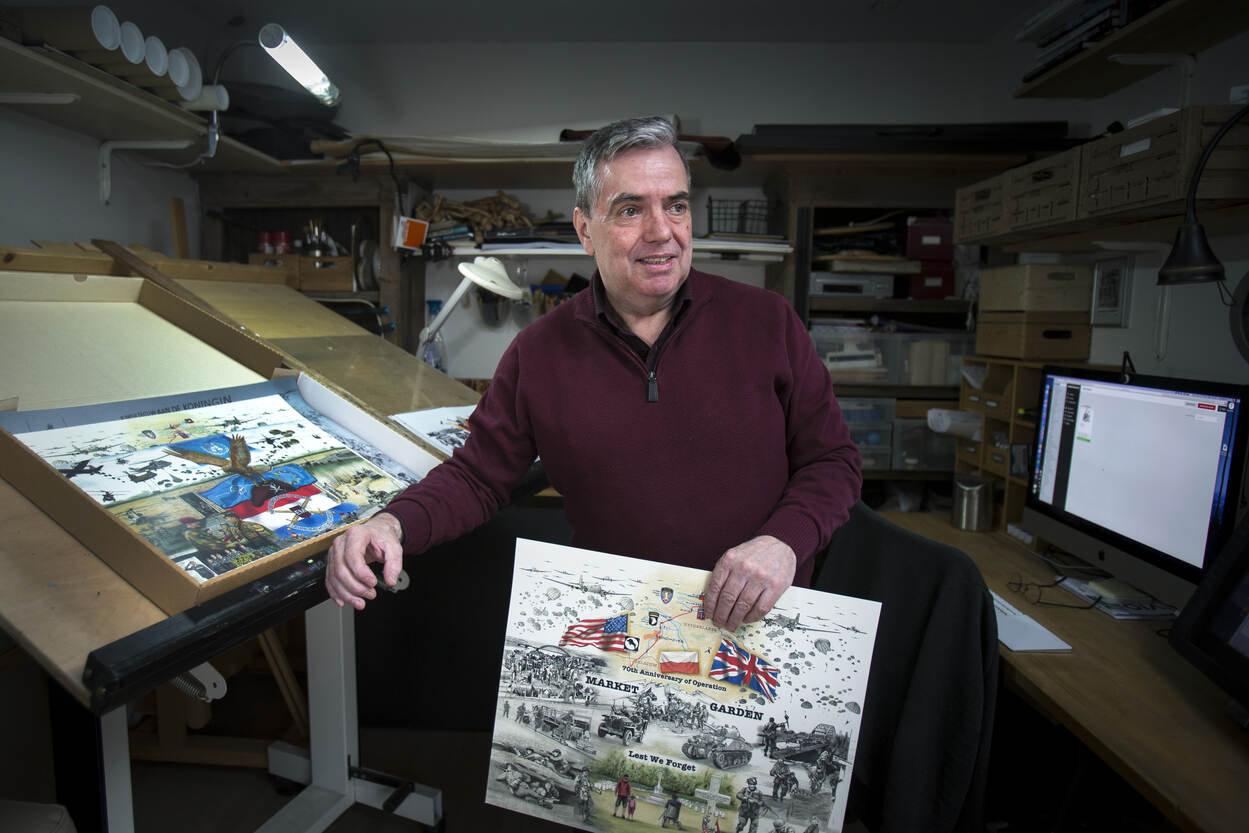 “Welkom in mijn atelier”, zegt Gelissen, als hij een achter kasten verborgen hoek in zijn woonkamer betreedt. Aan de muur bakjes met potloden en kwasten. In het midden van de ruimte een gigantische werktafel. Het is de plek waar Gelissen al tientallen portretten en militaire kunstwerken maakte onder de naam JoGeArt.