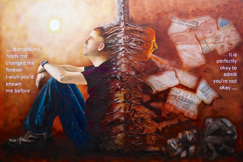 Hij werd opgenomen in het Centraal Militair Hospitaal in Utrecht. Voor zijn PTSS kreeg hij creatieve therapie. Een eerste stap naar genezing maakte hij met een potlood. “Zodra ik ging tekenen belandde ik in een andere, afgesloten wereld. Het bracht rust.” Al snel begon hij te schilderen. Hij ging aan de slag met de airbrush en leerde composities maken op de computer. De emoties, de onmacht: hij bracht het allemaal in beeld. “Ik heb in die zin PTSS van me af geschilderd.”