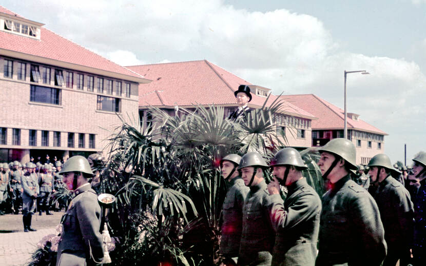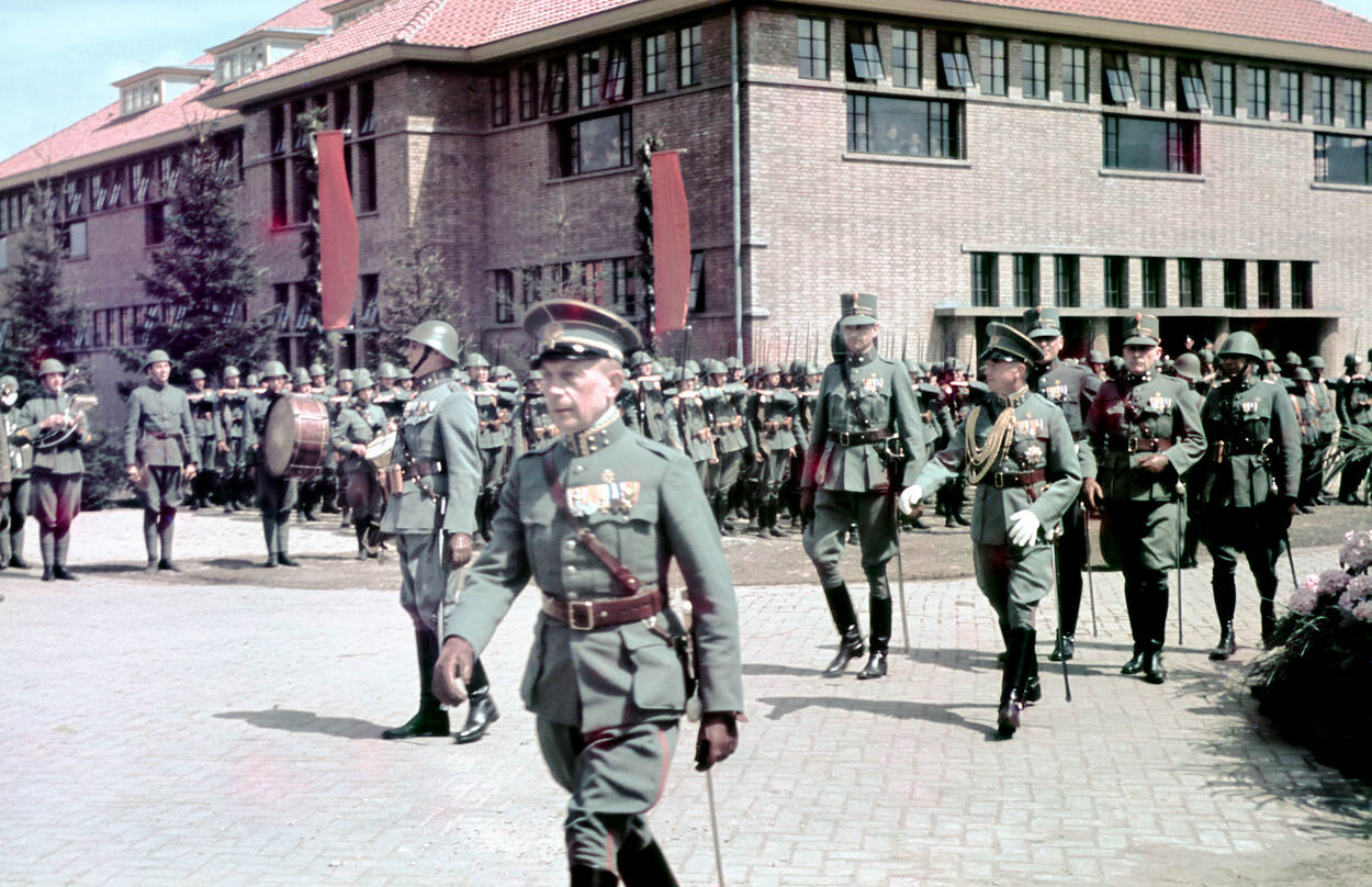 Van de opening in 1939 zijn unieke kleurenfoto’s bewaard gebleven, die amateurfotograaf Jan Stokking maakte. Generaal-majoor baron van Voorst tot Voorst loopt richting het spreekgestoelte. (Foto: J. Stokking/CODA Apeldoorn)