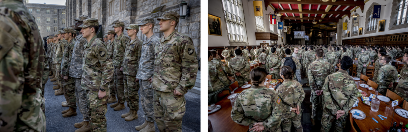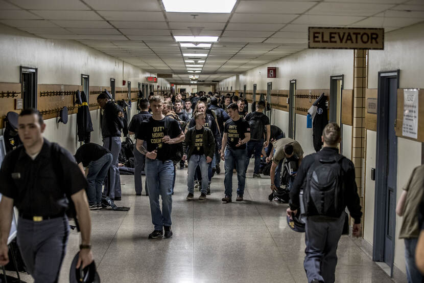 Alle officieren in spé verzamelen zich op gezette tijden op de binnenplaats en wandelen in formatie naar de grote eetzaal. Het gebouw heeft meerdere vleugels, waar alle 4.400 cadetten tegelijkertijd kunnen eten. Een cateraar werkt 24 uur per dag in 3 ploegendiensten om alle monden te voeden.