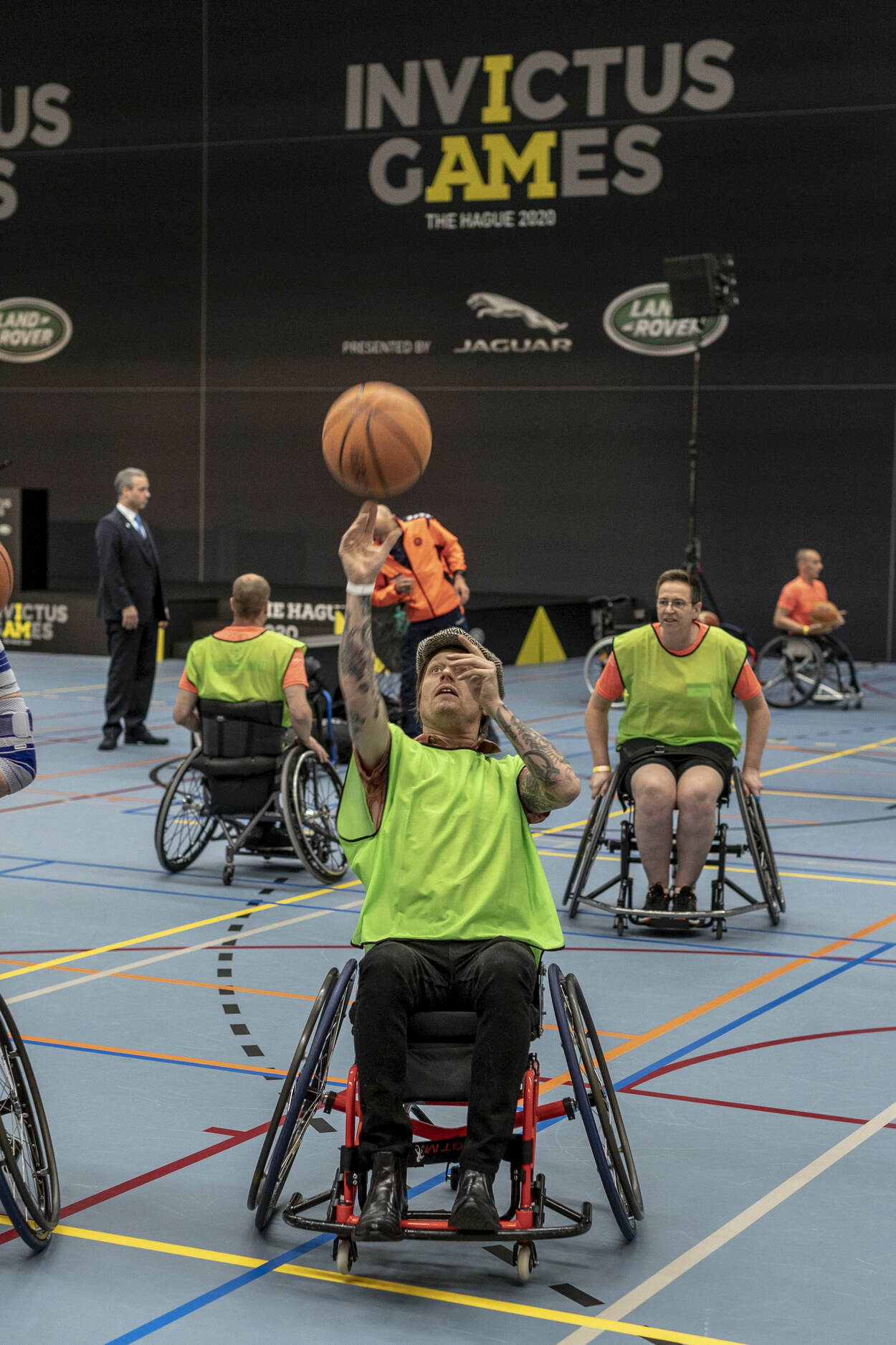 De Haagse band Di-rect speelt een prominente rol tijdens de IG2020. Gitarist Frans ‘Spike’ van Zoest - hier op de foto - en zanger Marcel Veenendaal wagen zich tussen de rolstoelbasketballers, tot grote hilariteit van Monique Dudink op de achtergrond.