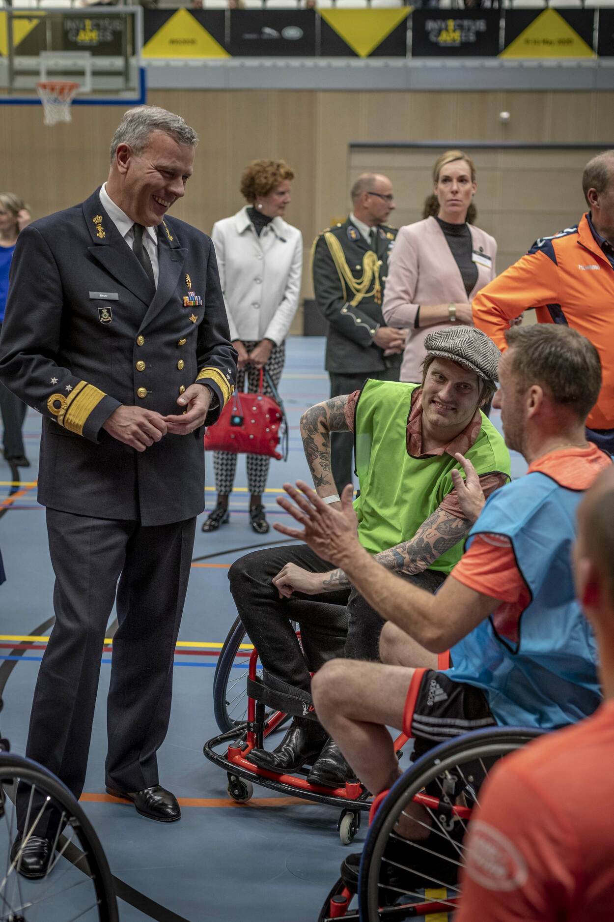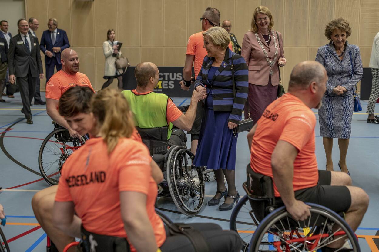 Erevoorzitter prinses Margriet (rechts), de Haagse burgemeester Pauline Krikke en minister van Defensie Ank Bijleveld maken kennis met de rolstoelbasketballers.