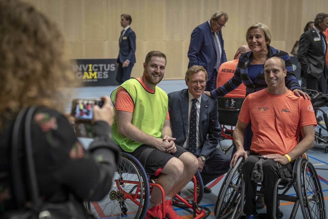 Even poseren. Rolstoelbasketballers Jelle van der Steen (rechts) en Jeffrey Vroegop gaan gewillig op de foto met de ministers Ank Bijleveld (Defensie) en Bruno Bruins (Medische Zorg).