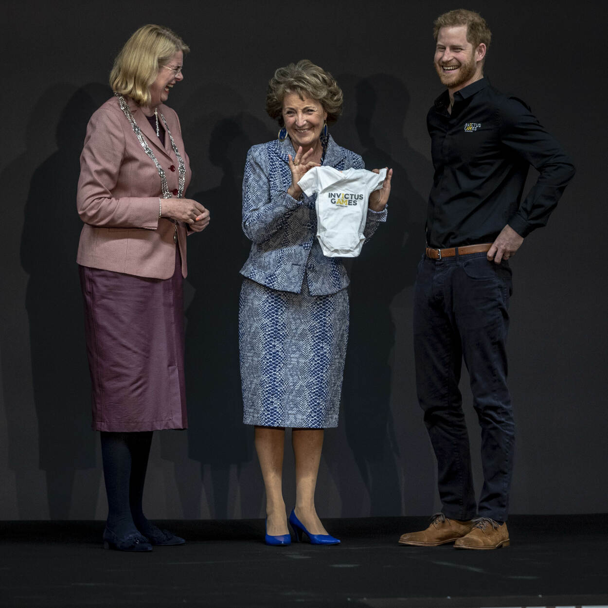Prinses Margriet overhandigde prins Harry een rompertje met het logo van de Invictus Games 2020 voor zijn pasgeboren zoon Archie. Minister Bijleveld van Defensie schonk de jonge vader ook een rompertje in camouflagekleuren. De Britse prins is zelf een (Afghanistan)veteraan, hij vloog in een Apache.