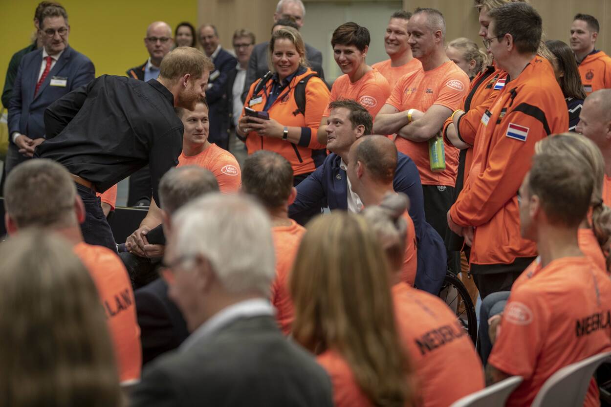Prins Harry toonde zeer veel belangstelling voor de Nederlandse (oud)deelnemers aan de Invictus Games. Hier is hij in gesprek met Esther Frijlink en Eric Hartwich. Beiden liepen een posttraumatische stressstoornis op door hun uitzending naar Bosnië. Frijlink is vorig jaar mee geweest naar Sydney, Hartwich hoopt er in Den Haag bij te zijn. De Brabander gaat voor vrijwel alle sporten die op het programma staan.