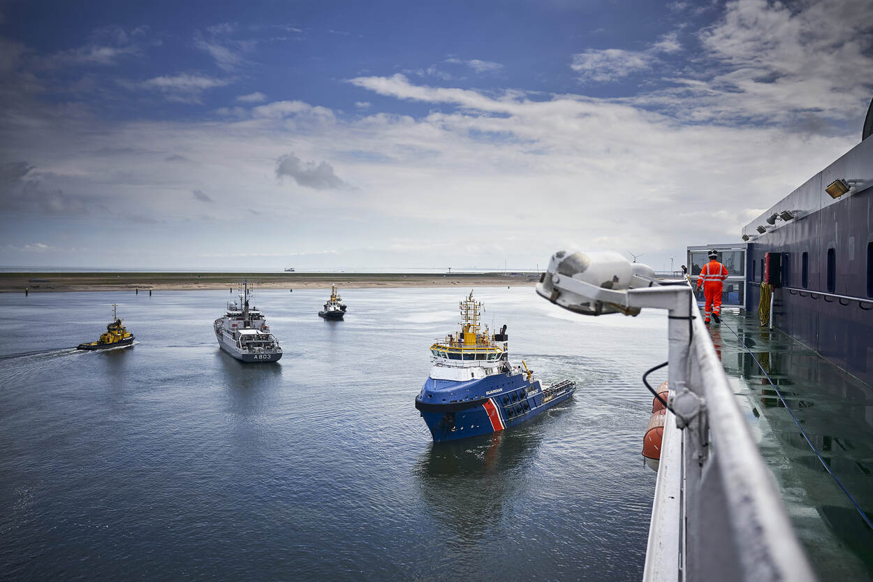 Voor het hydrografisch opnemingsvaartuig is het maar een klein stukje varen. The Pride bevindt zich niet op zee, maar ligt beschut in de Prinses Arianehaven nabij de tweede Maasvlakte. Volgens het draaiboek ziet de kapitein kans dicht onder de kust van Hoek van Holland te komen. Hier gaat het overgrote deel van de passagiers van boord. Haast is geboden, een armada van reddingsboten en aanverwante schepen zwermt rond de ferry. Helikopters van de Kustwacht en marine begonnen eerder al met een luchtbrug. Te water neemt de reddingsboot Jeanine Parqui van de KNRM als eerste passagiers aan boord.