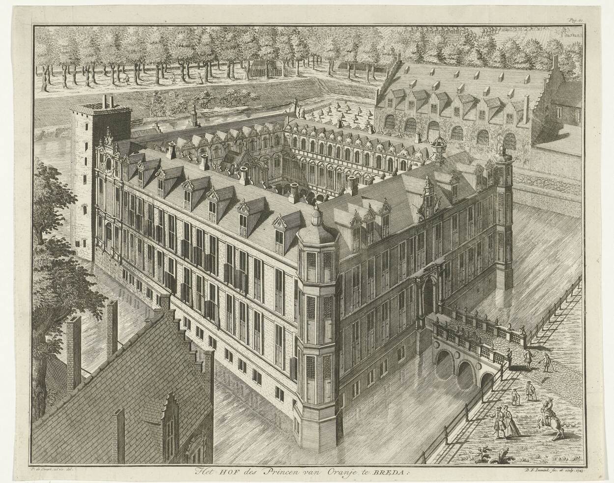Het Hof des Princen van Oranje in Breda. Het paleis was toen nog omgeven door een slotgracht. De brug leidt naar de Henricuspoort. Op de binnenplaats zijn de statietrap en ornamenten te herkennen. Naar een tekening van Pieter de Swart, 1680. (In collectie van het Rijksmuseum)