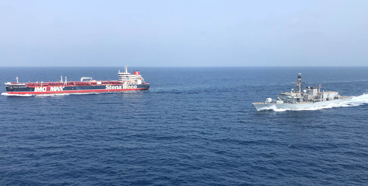 Eind juli confisqueerde Iran een Britse olietanker die door de Straat van Hormuz voer. Op deze foto wordt een andere tanker vergezeld door een fregat van de British Royal Navy, voor een veilige doorgang.