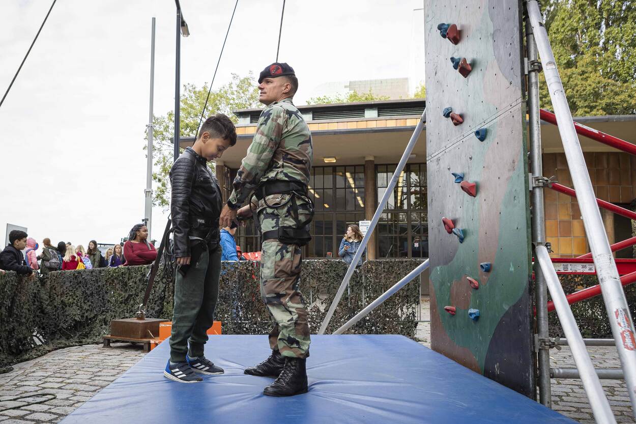 Vanochtend is Osman met zijn klasgenootjes van openbare basisschool Charlois de voetgangerstunnel onder de Maas doorgelopen voor een dagje Wereldhavendagen. Officieel is het een lesdag, maar vandaag zit hij niet met de neus in de boeken. De jongen stond lang in de rij voor de klimtoren van het Korps Mariniers maar eindelijk is hij aan de beurt. Het klimtuigje is omgehangen en Osman mag de toren op, gezekerd door een marinier. Vanaf boven heeft hij mooi zicht op Zr.Ms. Rotterdam die aan de kade ligt afgemeerd. Prachtig vindt hij!