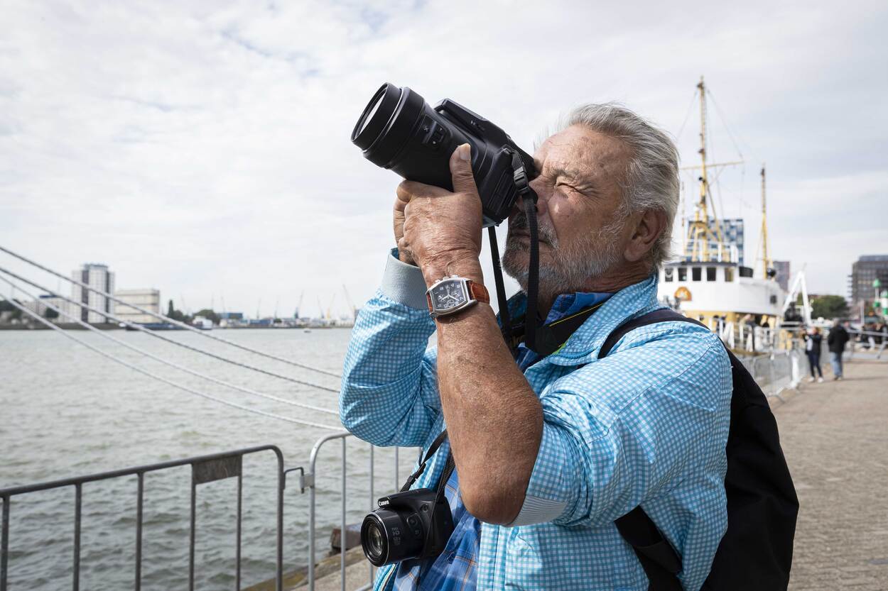 Met 2 camera’s om de nek en zijn zomerse outfit is hobbyfotograaf Cok de Coninck niet te missen. Met de metro komt vanuit Spijkenisse naar de Wereldhavendagen. “Het is natuurlijk elk jaar hetzelfde, maar toch mooi om vast te leggen”, vertelt hij terwijl hij zijn camera op Zr.Ms. Rotterdam richt. Als 14-jarige begon hij op de Rijnvaart, maar na 3 jaar moest hij eruit. Zijn hand kwam in een sluis tussen wal en schip. “De huid zat er nog aan, maar van binnen was alles kapot”, wijzend naar zijn linkerhand. “Daardoor werd ik afgekeurd voor militaire dienst. Ik had het graag gedaan.”