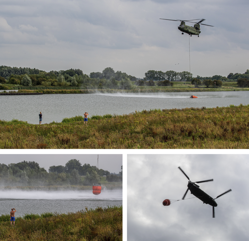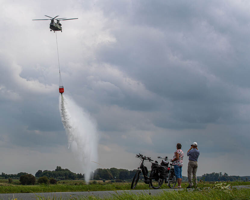 Bij rivier de Lek bij Everdingen wordt de natuurbrandbestrijding vanuit de lucht geoefend. Het duurt ongeveer 15 minuten om hier met de Chinook vanaf vliegbasis Gilze-Rijen te komen.