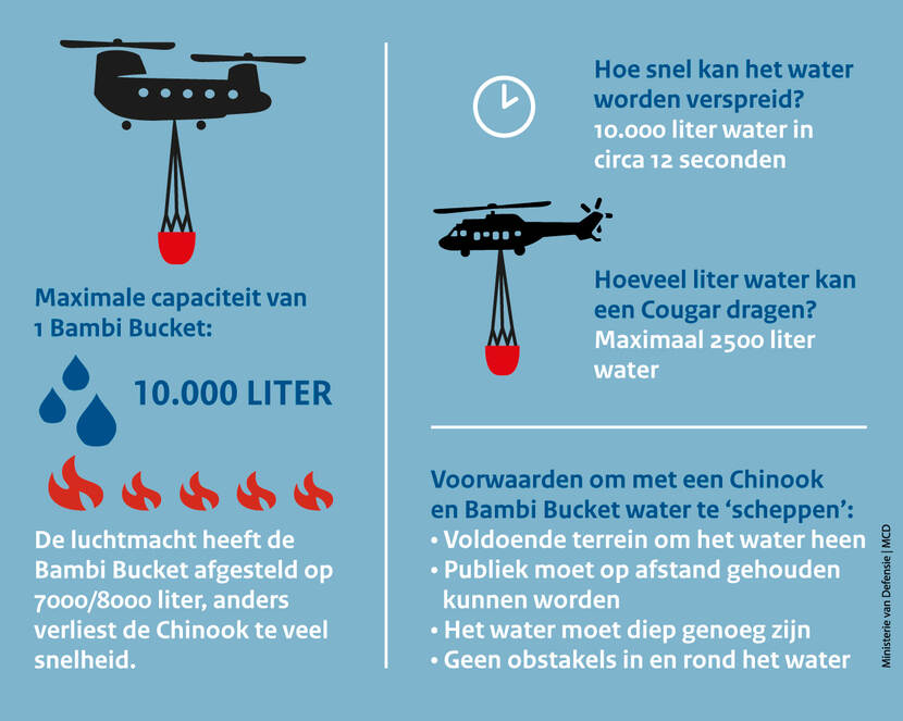 Defensie heeft 6 operationele Bambi Buckets, waarmee je water uit zee of een meer haalt.