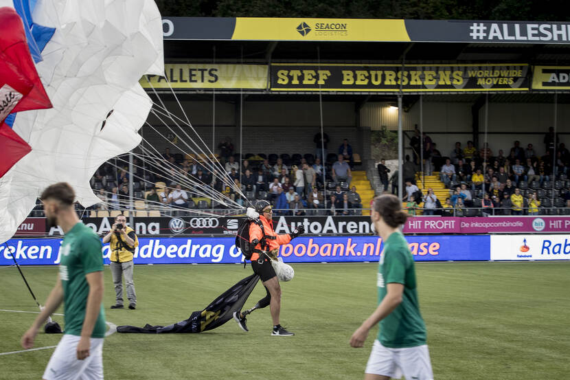 Met een precisielanding werd de wedstrijdbal afgeleverd door parachutisten.