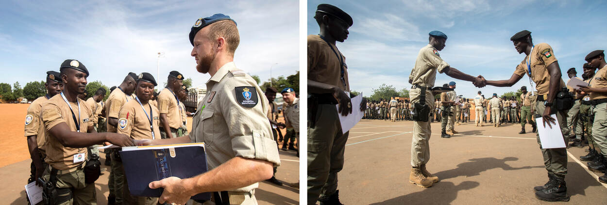 Na afloop van de certificaatuitreiking blikken de marechaussees terug op een paar intensieve, maar nuttige weken. “Ik had er niets van willen missen”, vertelt Rudi enthousiast. “Ik haal er altijd veel voldoening uit als ik mensen iets kan meegeven.” Tijdens de evaluatie spraken de lokale agenten hun dankbaarheid uit naar de instructeurs. Rudi kreeg van een leerling als persoonlijk bedankje een speld met de Nigerese vlag. “Daar doe je het voor”, besluit Rudi glunderend.