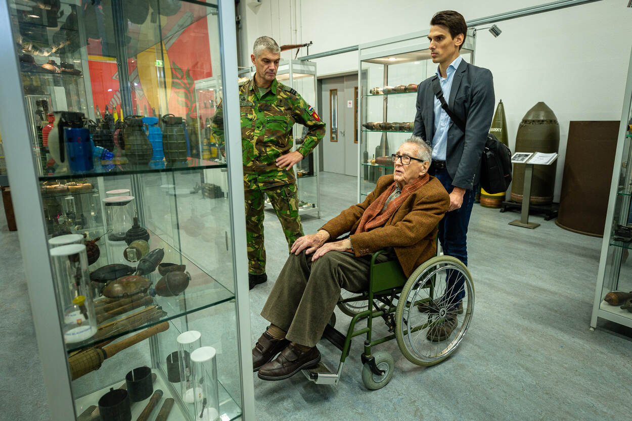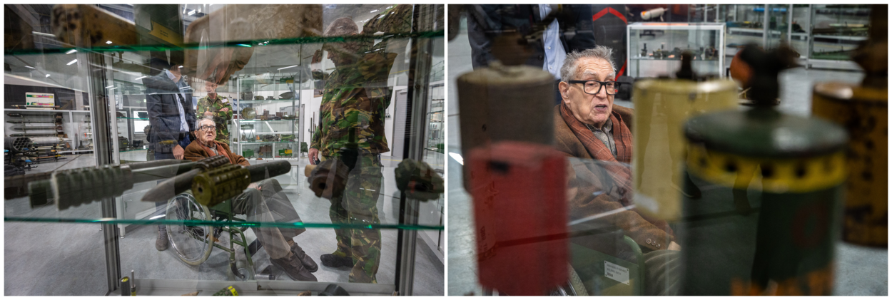 Joop Kotterer (94) krijgt een rondleiding bij de Stichting Geschiedkundige Verzameling EOD op de Sergeant-majoor Scheickkazerne. De voormalige ruimer herkent nog menig explosief.