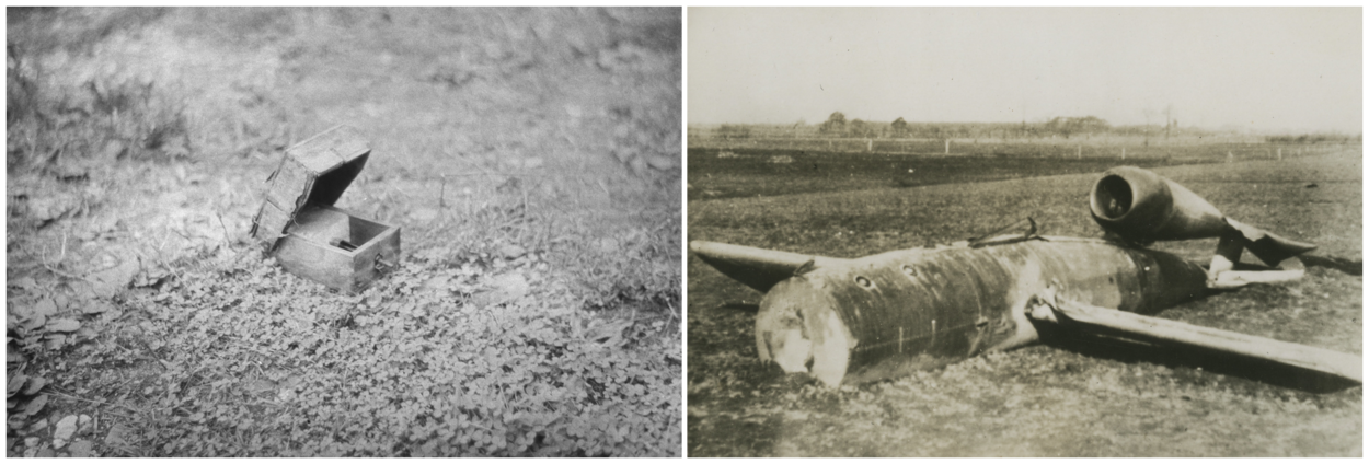 Een Schu-mine. Deze Duitse antipersoonsmijn werd tijdens de Tweede Wereldoorlog veel gebruikt. (Foto: Piet van der Ham, Nationaal Archief/Anefo) Foto rechts: Een van de meer dan 30.000 afgeschoten V-1’s.