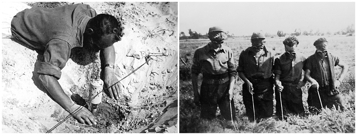 Een Duitse S-mine wordt blootgelegd (links). Prikkend sporen militairen mijnen op in Limburg (1945).