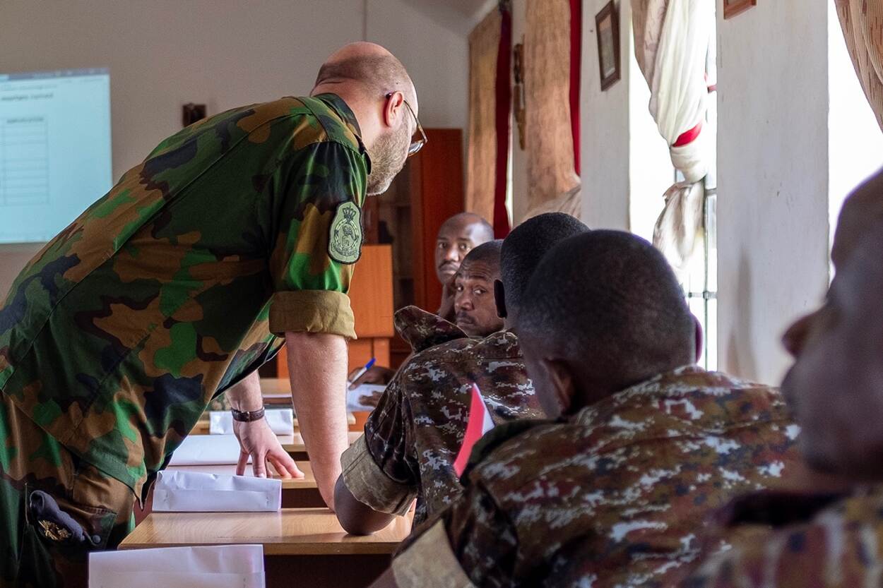 Samen met een Brit hebben 3 Nederlandse militair juristen onlangs in het Oegandese Jinja een zogeheten Air Force Course verzorgd. Daarbij zijn diverse juridische aspecten van de inzet van luchtstrijdkrachten aan de orde gekomen. Defensie is sinds een aantal jaar betrokken bij het Legal Training Centre van het Oegandese leger. Foto: kolonel Michael Meijburg.