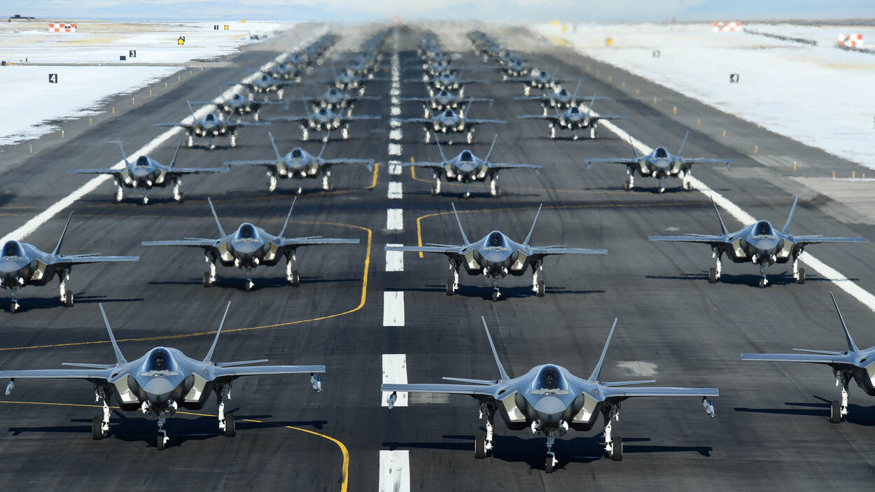 Volgens sommige Amerikaanse media is er wel degelijk een verband met de situatie in het Midden-Oosten. Hoe dan ook, 52 F-35’s op 1 startbaan is een bijzonder gezicht.