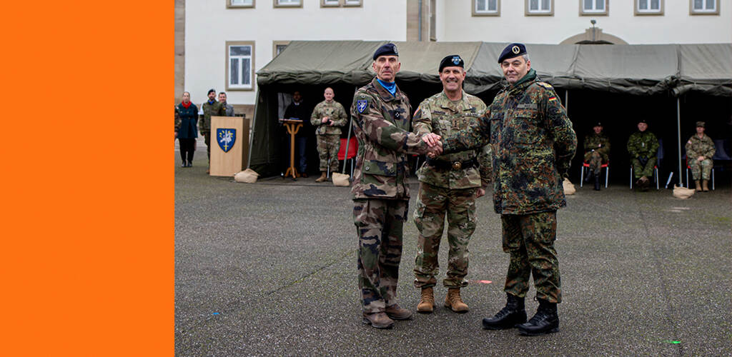Met een traditionele vaandeloverdracht heeft het Duits-Nederlandse 1GNC uit Münster in Straatsburg (Frankrijk) afstand gedaan van zijn tijdelijke taak als commandant van de NATO Response Forces Land (NRF). Een jaar lang stond het internationale hoofdkwartier paraat voor deze opdracht. Sinds 1 januari tekent het zogenoemde Eurocorps hiervoor en blijft dat de komende 12 maanden doen. Op de foto slaan drie luitenant-generaals de handen ineen: rechts commandant 1GNC, de Duitser Alfons Mais .Links zijn collega van Eurocorps, Laurent Kolodziej uit Frankrijk. In het midden de Amerikaanse commandant van Allied Land Command Izmir, de Amerikaan J.T. Thomson die het vaandel terugnam van 1GNC en doorgaf aan Eurocorps. Thomson sprak bij die gelegenheid zijn waardering uit voor de inzet van het Duits-Nederlandse korps. (foto Lt.Col Travis Dettmer).