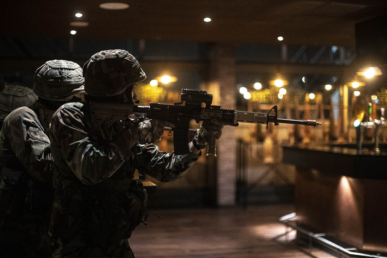 De Kuip is meer dan een voetbalstadion. En dus kan een bar een (bijzondere) achtergrond zijn voor de eindoefening van de mariniersopleiding, zoals de foto van sergeant-majoor Hille Hillinga bewijst.