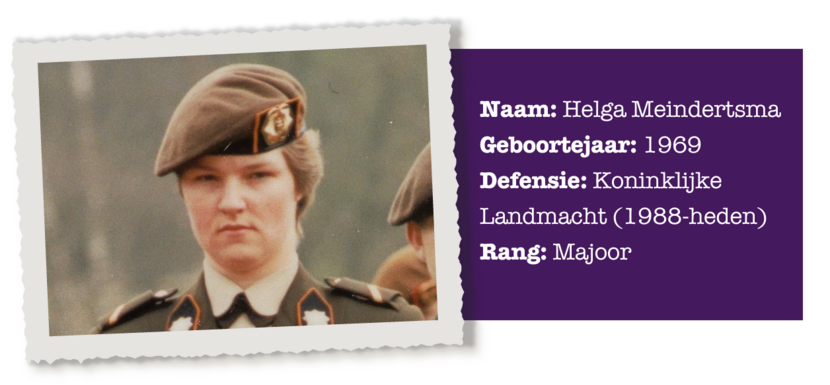 In oktober 1988 begint Helga Meindertsma aan een opleiding die nog niet eerder door een vrouw is voltooid: die tot officier bij de infanterie. Helga gaat samen met de dienstplichtige officieren in opleiding met een ‘kort contract voor vrouwen’ op de Jan van Schaffelaerkazerne in Ermelo.