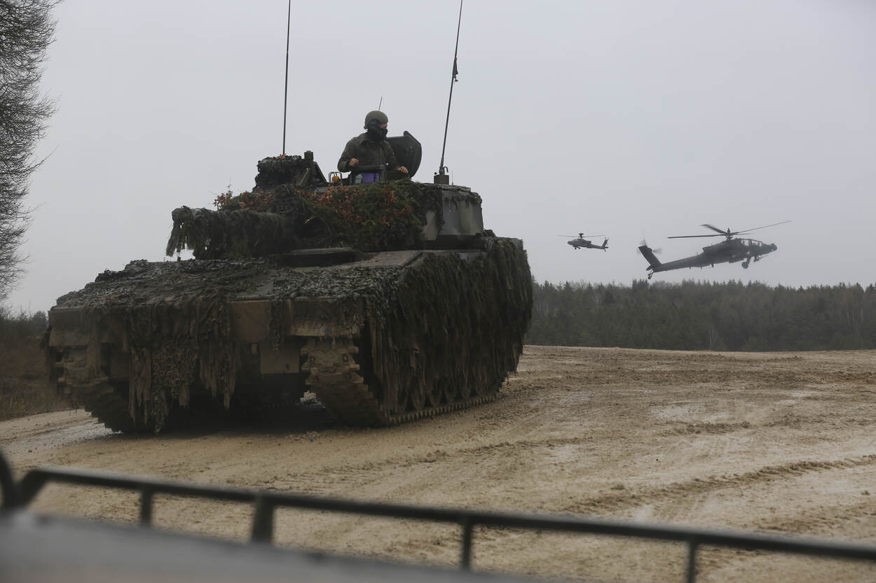 Een CV90 van 43 Gemechaniseerde Brigade wacht op orders om in actie te komen terwijl op de achtergrond een paar Amerikaanse Apache helikopters vliegen. De vriendschappelijke ontmoeting vond plaats op het oefenterrein in Hohenfels. Daar oefenden meer dan 5.000 militairen; Amerikanen, Nederlanders en collega’s uit 15 landen. Foto: U.S. Army specialist Hayden Allega.