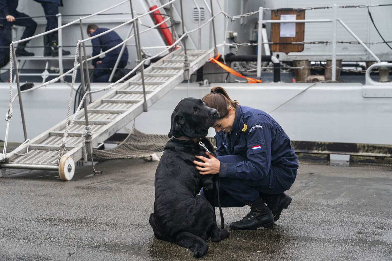 Op deze foto neemt een korporaal afscheid van haar hond, omdat ze met Zr.Ms. Willemstad 4 maanden gaat varen. Het mijnenbestrijdingsvaartuig sluit aan bij het permanente NAVO-vlootverband dat gezamenlijk zeemijnen en vliegtuigbommen gaat ruimen op de zeebodem tussen België en Noorwegen. Er liggen naar schatting nog vele duizenden gevaarlijke projectielen. Foto: Paul Tolenaar.