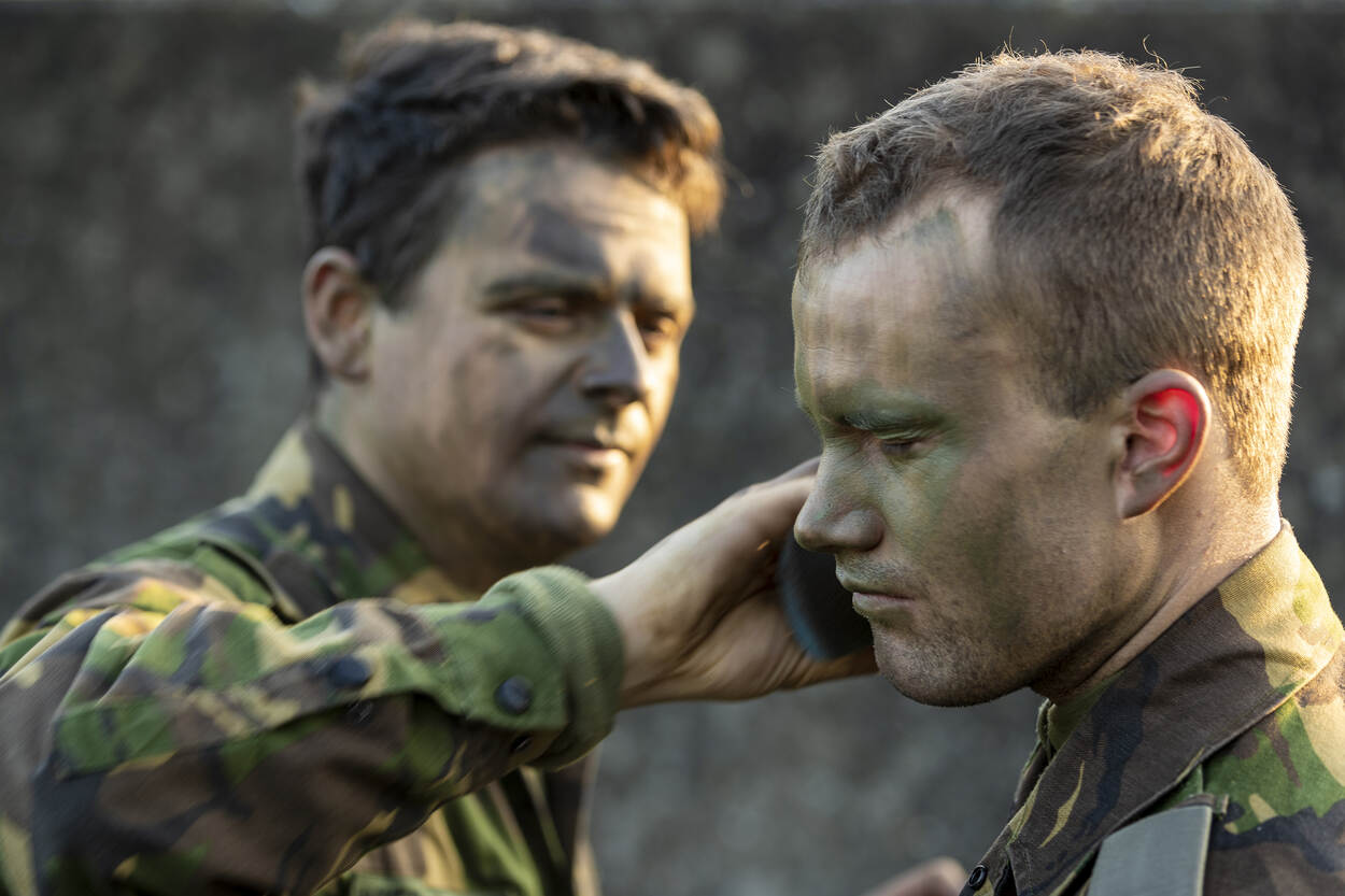 Wie de Algemene Militaire Opleiding heeft doorlopen verdient natuurlijk zijn baret. Net voor de uitreiking werd deze foto gemaakt, waarop de militairen elkaar nog even camoufleren. Zo marcheren ze gefatsoeneerd en onder toeziend oog van vrienden en familie, richting de appèlplaats. Foto: sergeant Cristian Schrik