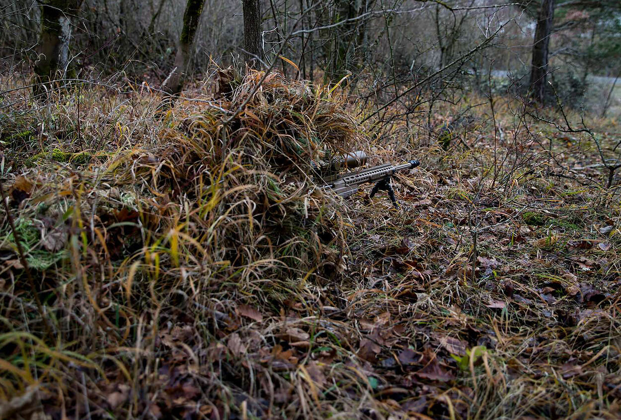 Puur natuur. Althans, zo lijkt het. Deze (Duitse) soldaat ligt goed gecamoufleerd achter een scherpschuttersgeweer G22A2 . Foto: Bundeswehr, Torsten Kraatz.