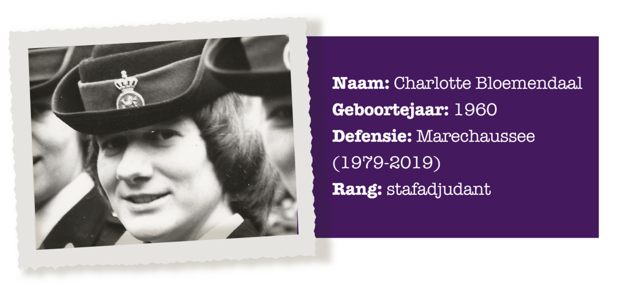 Op 3 september 1979 meldde Charlotte Bloemendaal zich met nog 6 andere vrouwen aan de poort van de Koning Willem III kazerne in Apeldoorn. “We wisten wel dat we de eerste vrouwen waren die een opleiding bij de marechaussee zouden gaan volgen, maar niet dat het zo’n enorme impact zou hebben. Dat merkten we op de dag van opkomst en de dagen erna: de ene na de andere foto werd van ons gemaakt. Men bleef naar ons kijken.”